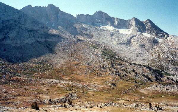 Looking back towards Burro Pass just below the rough section below the pass. A view of the pass (center), Sawtooth Ridge, and to the right, Matterhorn Peak. Note the faint trail.