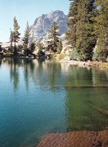 The Benson Lake Loop, August 2002After a last look back down the canyon, I marched the short distance to a cozy wood bordering a beautiful lakelet. A look at the map told me I was in the vicinity of four small lakes, but I would only see the one. I should have taken the time to study my map and done some walking: another missed opportunity. Actually there were over ten small lakes in the area, but I would only see two, although two small additional ones were dried up. But the one I was presently at was a little Sierra jewel. On the side I was on it was bordered by a long grove of pines, while the rest of the lake was bordered by white clean granite that framed the Sierra skyline. Trees studded the granite in picturesque ways, and a large dome to the northeast reflected itself in the calm waters of the fairly deep lake.