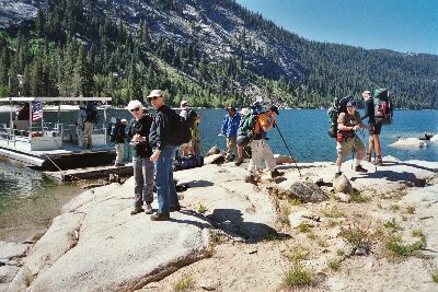 After a snack and a ticket purchase, we all headed out to the ferry to PCT/JMT at the other end of the lake. A few day-hikers joined us, and it was amusing to see the long line of backpacks stacked along the middle of the boat. We had a full load.
