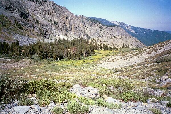 Eventually it was time to get it together and hike up another large step of the canyon. Actually, it was a fairly short hike interspersed with occasional stops for views down the canyon as it all opened up for me to see. I was at the top of the timberline so my viewing was unobstructed. At the top of the step with a few scattered trees in a broad grassy area that sported at least one small spot for a bivy, I decided another rest break was in order because from that point on I would be on the lengthily switchbacks climbing to Black Rock Pass.