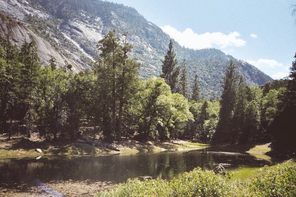 You can clearly see the gash of the stream coming down the granite canyon wall, which the trail crosses. You can also see the general route of the trail back to Harden Lake. Don't drink the water.