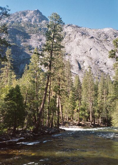 We did not hang around. In fact, we blew right by the camps and headed for the bridge. At first, I wondered if there was a bridge, but after navigating a little riverside pathway, it showed up. I have to say, the whole area is very picturesque, another Yosemite Valley in some respects, with the high granite walls and bridged waters. Morning is the best time in the wilderness, and this was a very good day. It was a joy seeing the high walls and the sun streaming through the trees.